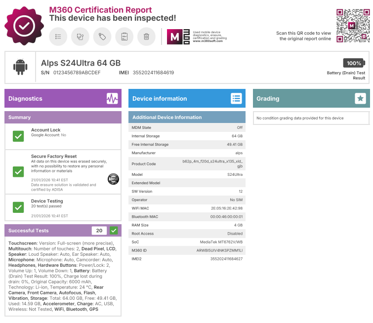 - This device has been tested using M360 Mobile Diagnostics software to confirm hardware functionality, carrier lock status, and blacklist status. Please take a look at the attached photo detailing the mobile diagnostic report details.