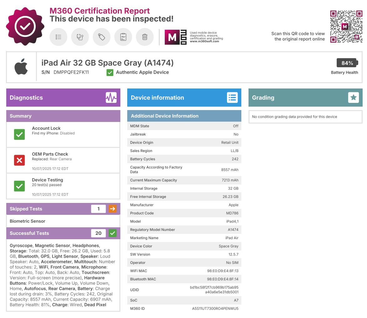 - iPad is tested, working, and has been factory reset. Please take a look at the attached photo with the testing report details, as well as the report details at the bottom of this description.
