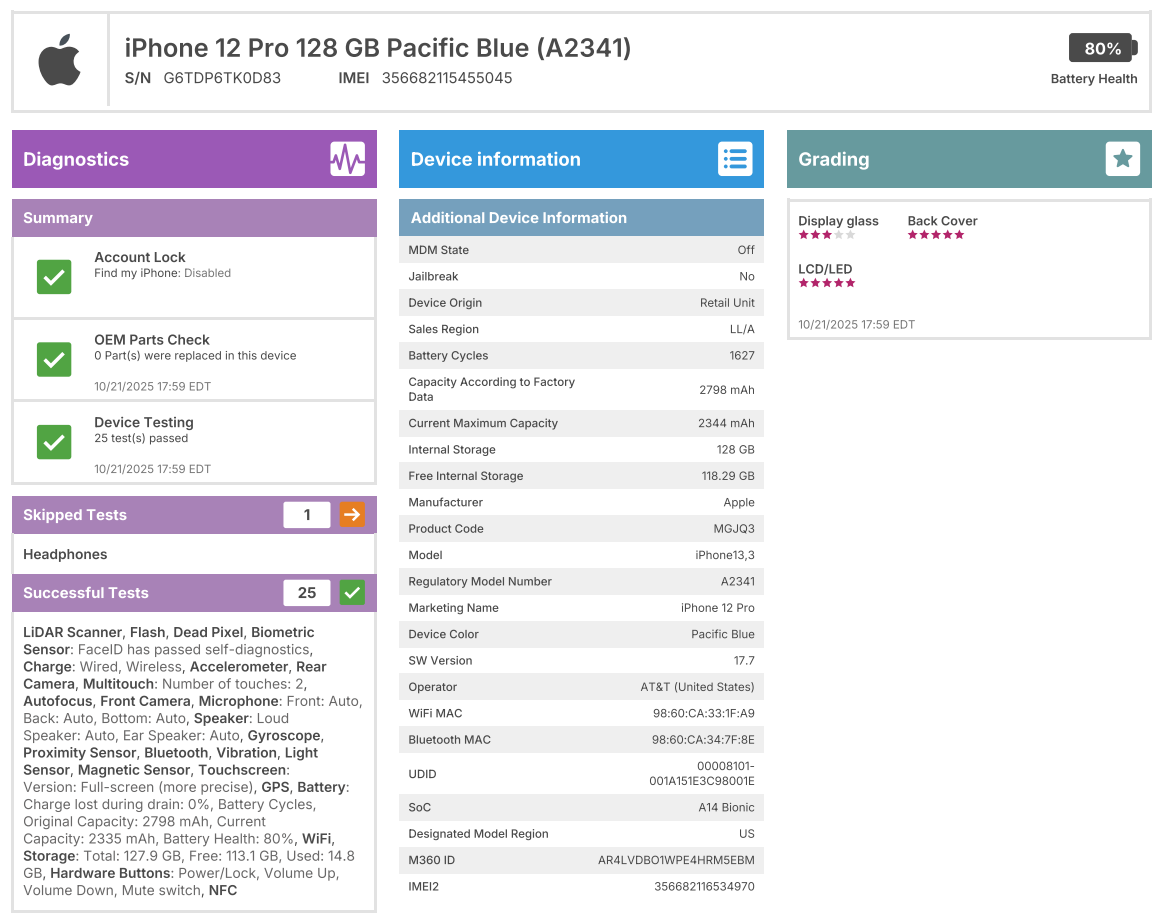 - Phone is tested, working, and has been factory reset. Please take a look at the attached photo with the testing report details, as well as the report details at the bottom of this description.