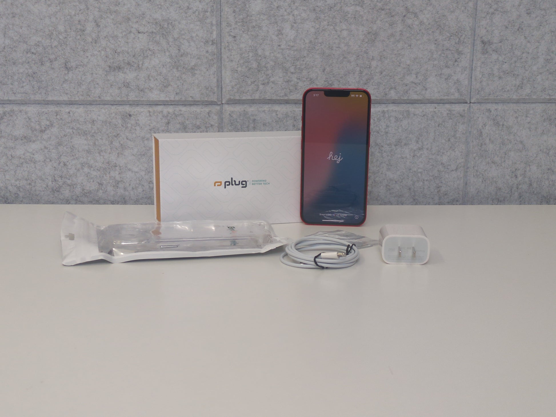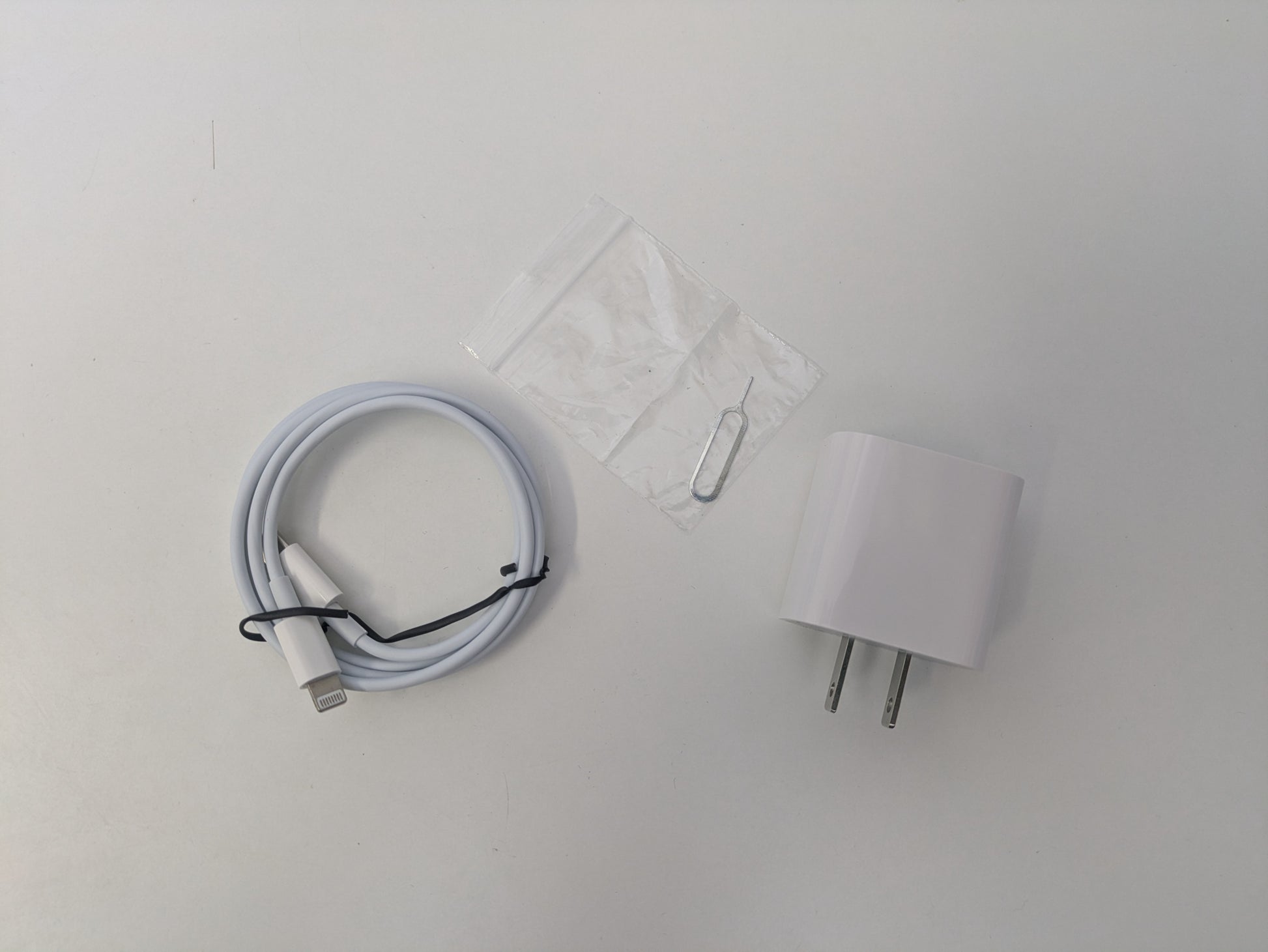 Includes phone, USB-C to lightning cable, USB-C charging brick, SIM removal tool, and clear case.