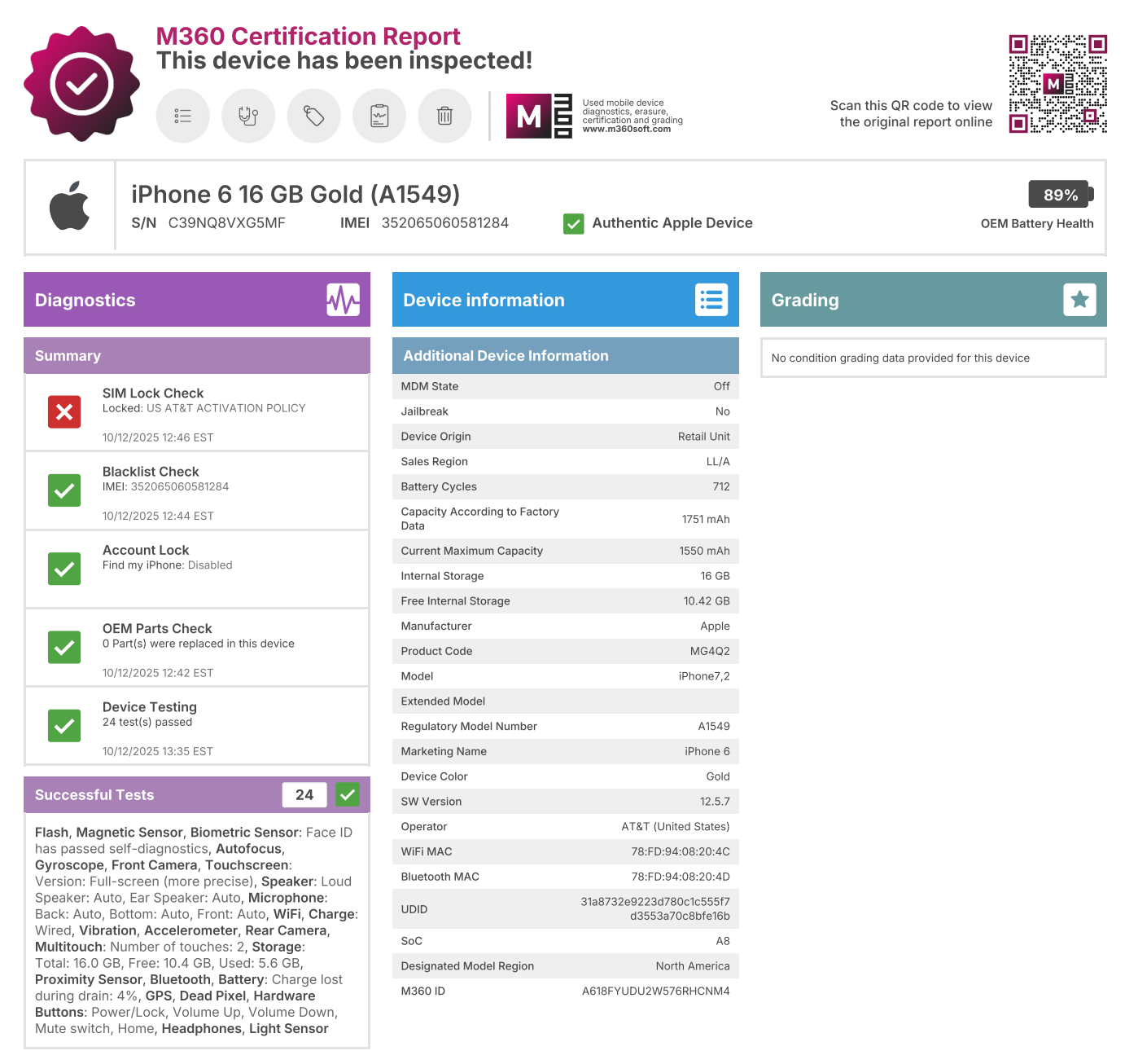 - This device has been tested using M360 Mobile Diagnostics software to confirm hardware functionality, carrier lock status, and blacklist status. Please take a look at the attached photo detailing the mobile diagnostic report details.
