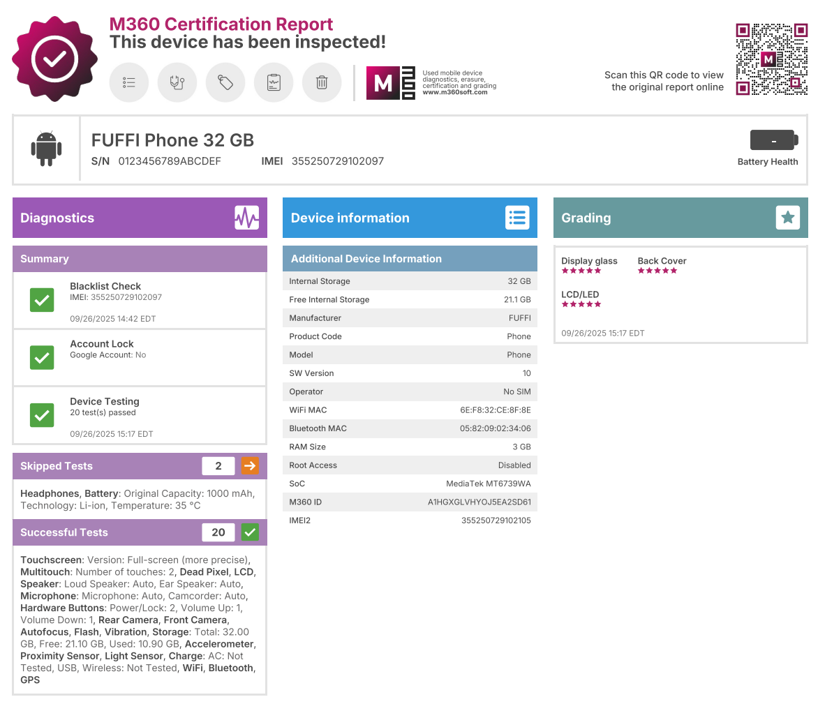 Phone is tested, working, and has been factory reset. Please take a look at the attached photo with the testing report details, as well as the report details at the bottom of this description.
