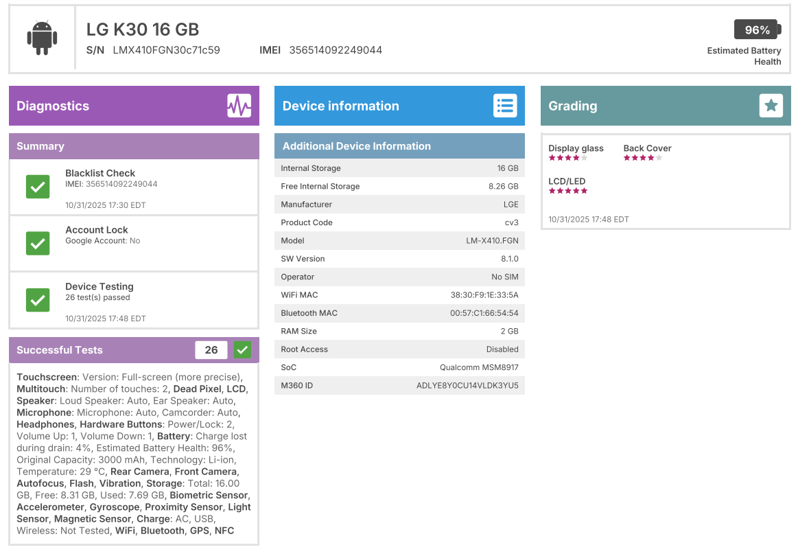 - Phone is tested, working, and has been factory reset. Please take a look at the attached photo with the testing report details, as well as the report details at the bottom of this description.