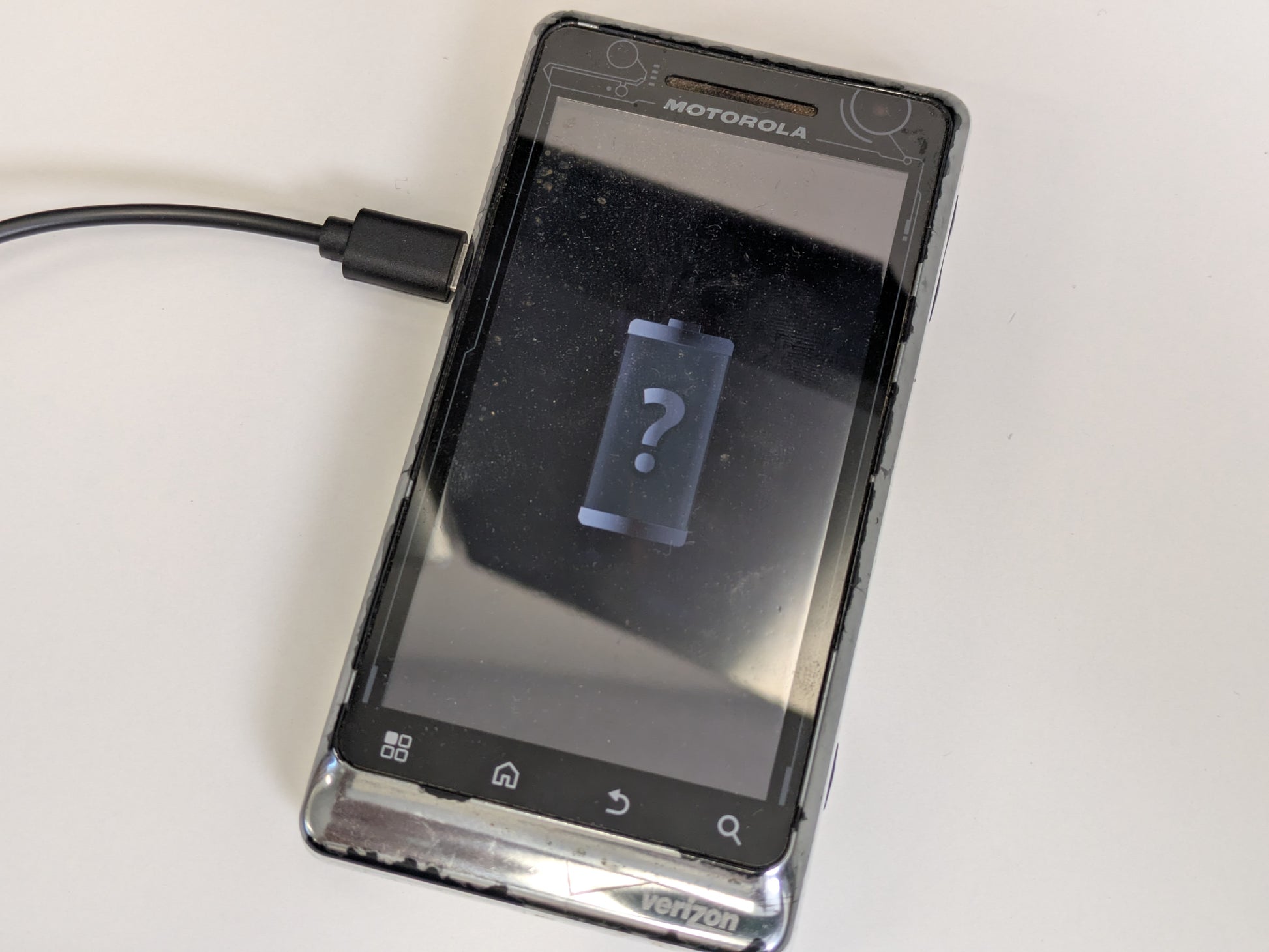 - Phone will not charge. When attempting to charge, the battery indicator shows a question mark ("?") rather than a charge level.
