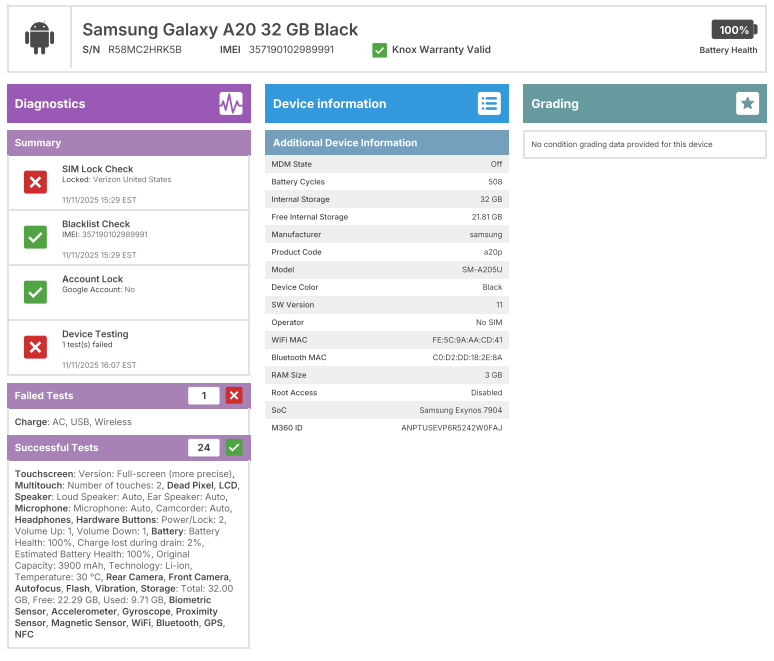 Samsung Galaxy A20 - 32GB - Black - Verizon - USED
