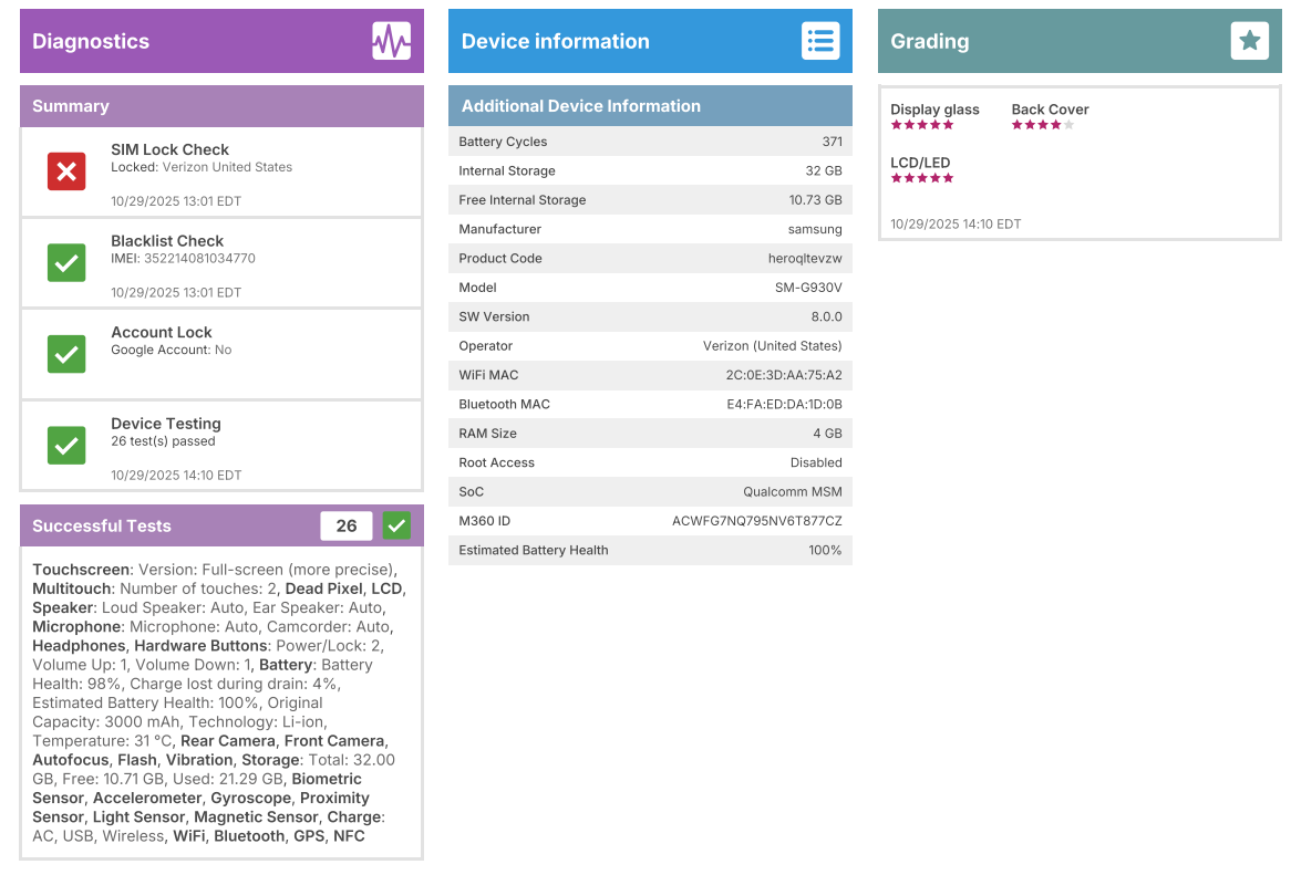 - Phone is tested, working, and has been factory reset. Please take a look at the attached photo with the testing report details, as well as the report details at the bottom of this description.