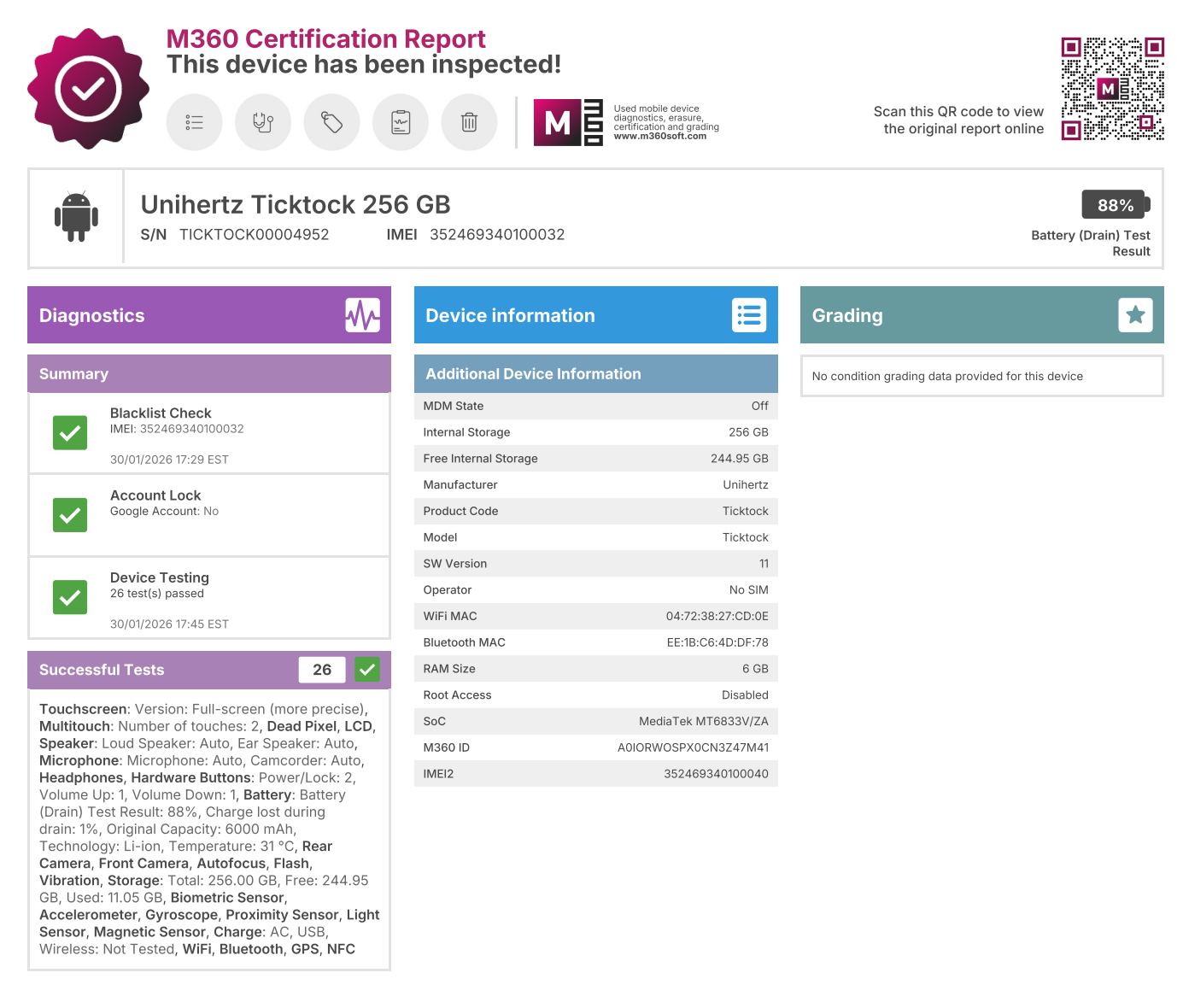 - This device has been tested using M360 Mobile Diagnostics software to confirm hardware functionality, carrier lock status, and blacklist status. Please take a look at the attached photo detailing the mobile diagnostic report details.