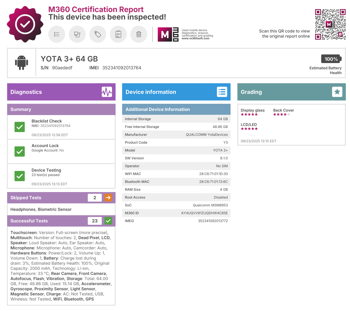 - Phone is tested, working, and has been factory reset. Please take a look at the attached photo with the testing report details, as well as the report details at the bottom of this description.